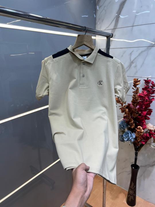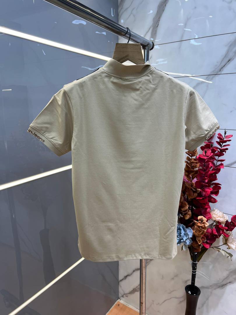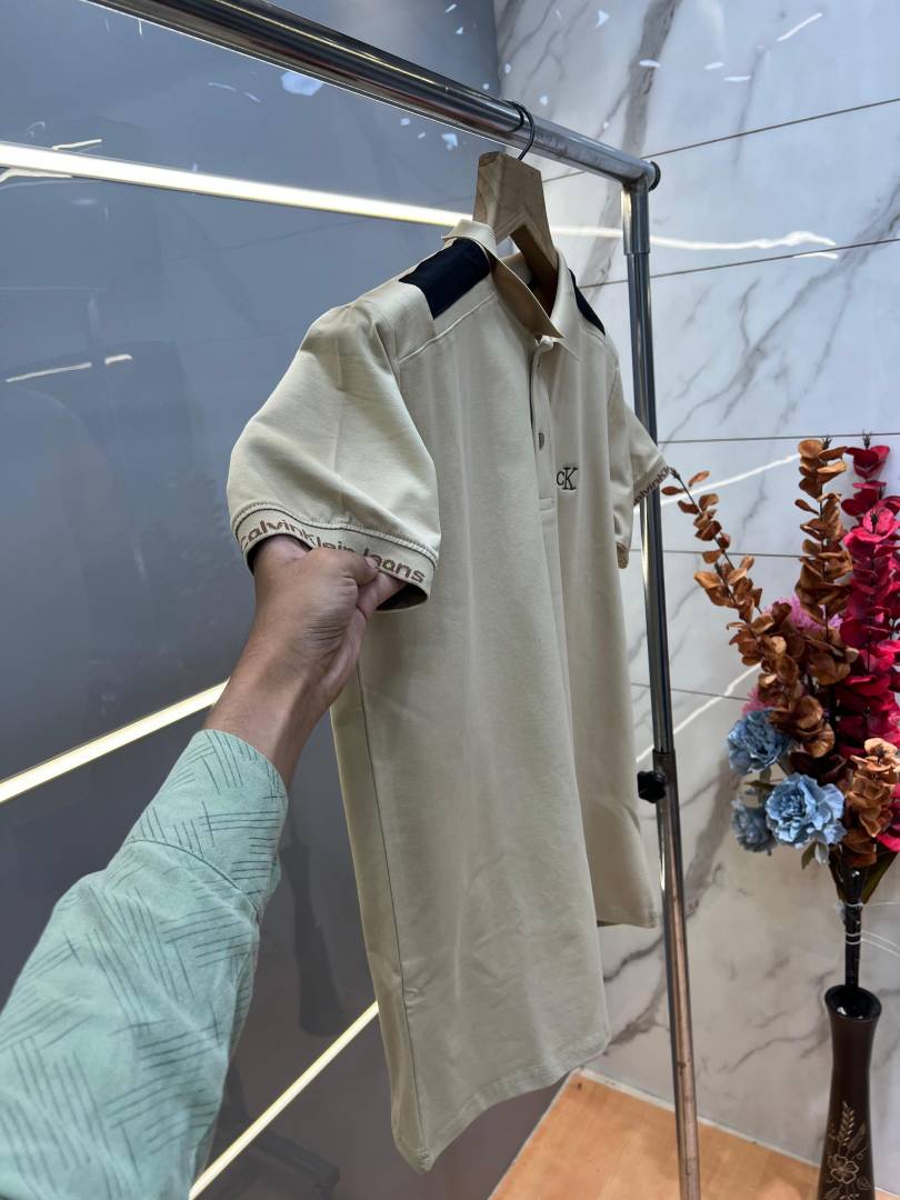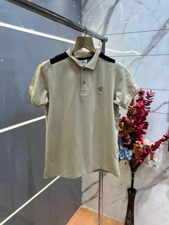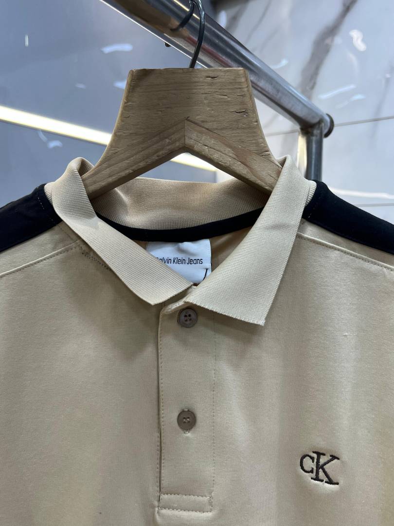 Calvin Klei n Beige Premium Imported 240 GSM Interlock Lycra Fabric Polo Tshirt with Shoulder Design and Embroidered Logo 4012